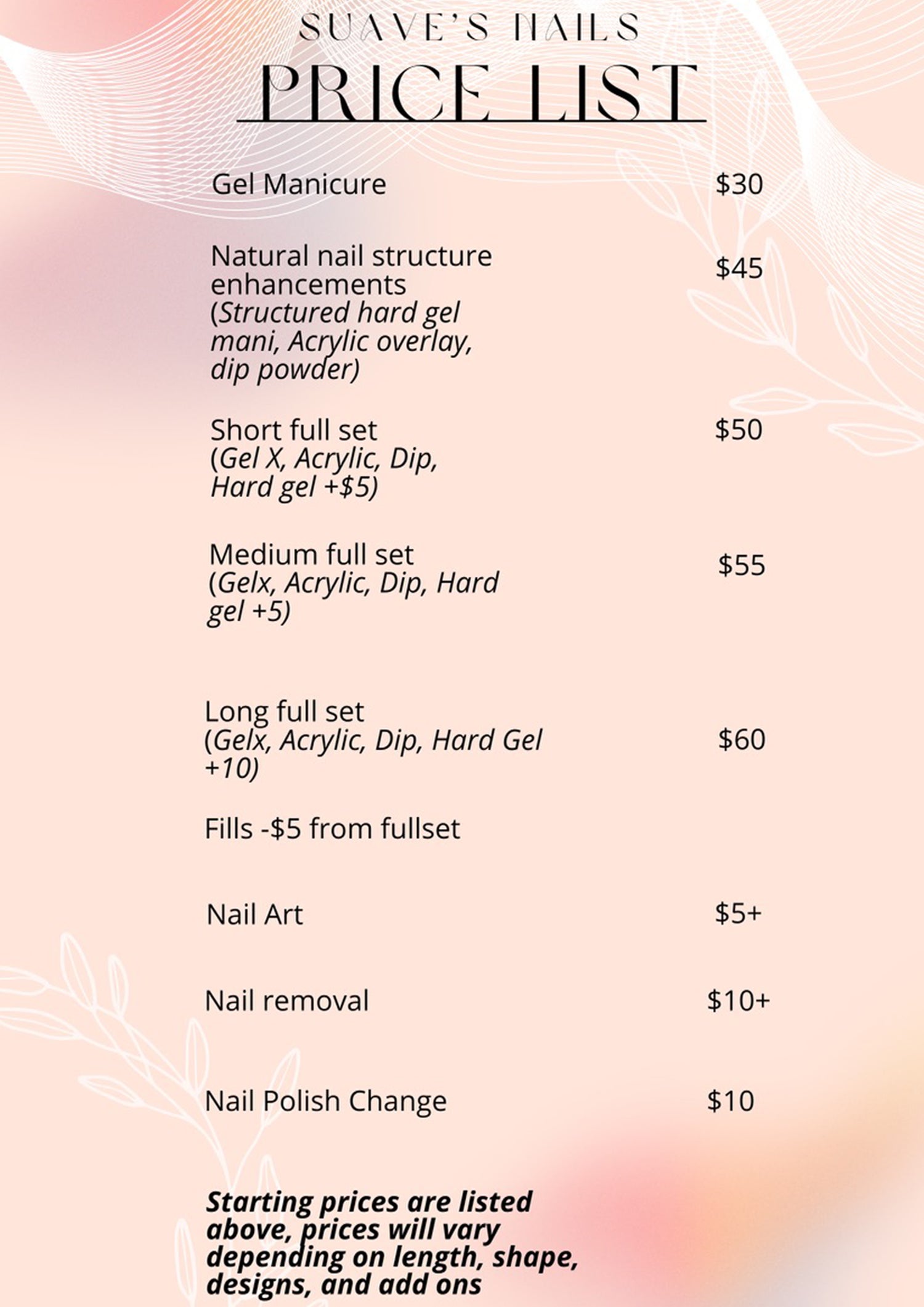 - Basic ($30) : cuticle/nail care, sugar scrub, heel scrub, foot/leg massage, hot towels, and polish.